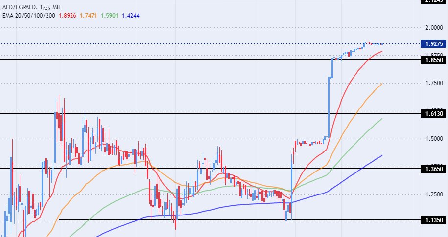 على الصعيد الفني، حافظ زوج الدرهم الإماراتي مقابل الجنيه المصري على ارتفاعه ضمن الاتجاه العام الصاعد الذي يسجله الزوج، حيث يتداول الزوج اعلى متوسطات الحركة 20 و50 و100 و200 على التوالي على الإطار الزمني لليوم في إشارة للاتجاه العام الصاعد الذي يسجله الزوج على المدى الطويل. كما تداول الزوج اعلى مستويات الدعم التي تتركز عند مستويات 1.855 و1.6130 على التوالي. بينما يتداول الزوج اقل من مستويات المقاومة التي تتركز عند مستويات 2.12 و2.526 على التوالي. من الممكن ان يسجل الزوج بعض الارتفاعات بالتزامن مع الخفض المتوقع لسعر الجنيه المصري خلال الفترة القادمة.