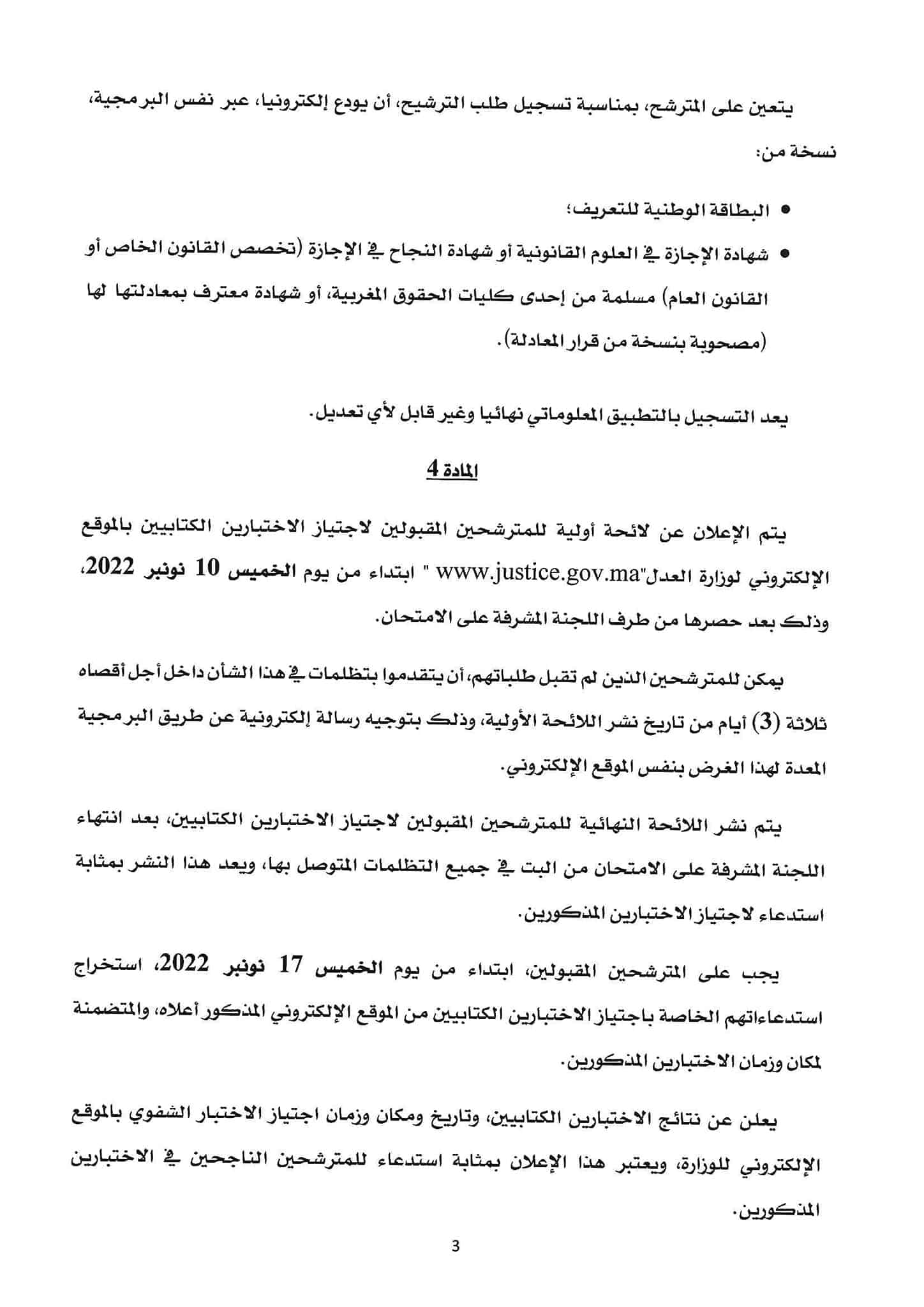 يجب على المترشحين المدعوون إنطلاقا من يوم الخميس 17 نونبر 2022 استخراج استدعاأتهم الخاصة باجتياز الاختبارين الكتابيين من الموقع الرسمي www.justice.gov.ma وتحتوي على مكان وزمان الاختبارين المذكورين.