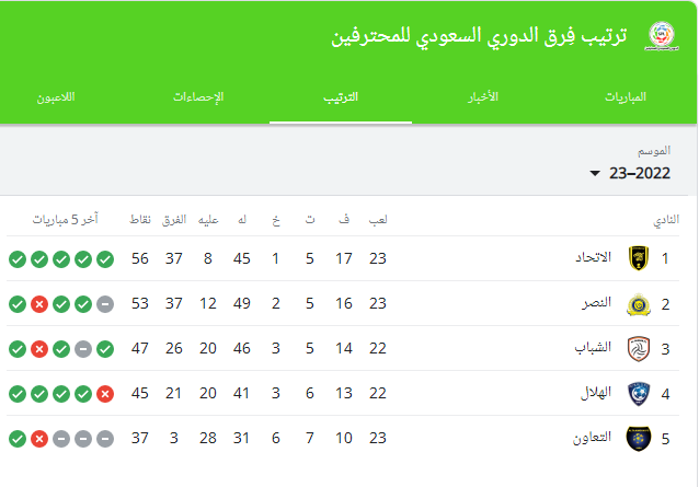 و ترتيب فرق الدوري السعودي للمحترفين كما هو موضح بالصورة التالية.