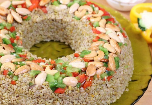 7. في قالب كيك ضعي المكسرات المقلية والفلفل، ضعي الفريكة فوق الفلفل مع الضغط عليها جيداً. اقلبي الفريكة على طبق التقديم.